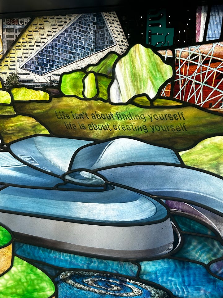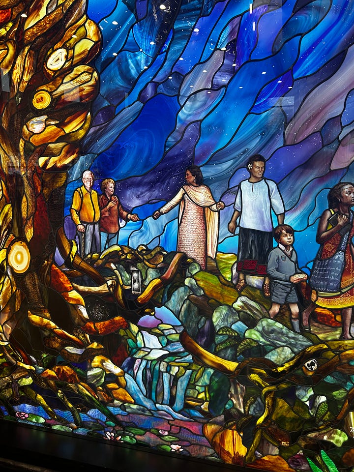 The windows were surreal to see again. I’ve held immense reverence for them since my first and only encounter (up until now) at a debate tournament I attended in 2018. 6 years ago. 6 doesn’t feel right but it is, both ancient history and yesterday in my head. I remember sneaking away from debate rounds with my new, cool upperclassmen friends to just stare at the massive panes of colored glass. They tells the story of humanity through art and architecture and literature. They’re gorgeous, detailed, vivid, and so loving towards humanity. My memory of the rest of the tournament is seen through the dyed light they shone down on us.